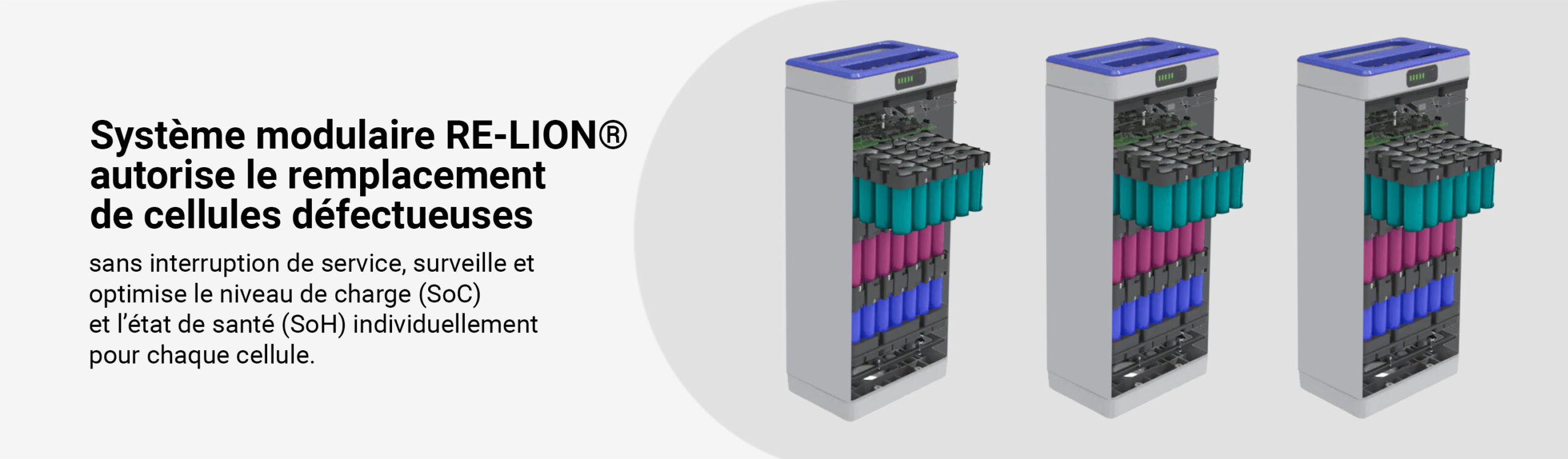 Le système modulaire RE-LION autorise le remplacement de cellules défectueuses, sans interruption de service, surveille et optimise le niveau de charge (SoC) et l’état de santé (SoH) individuellement pour chaque cellule.
