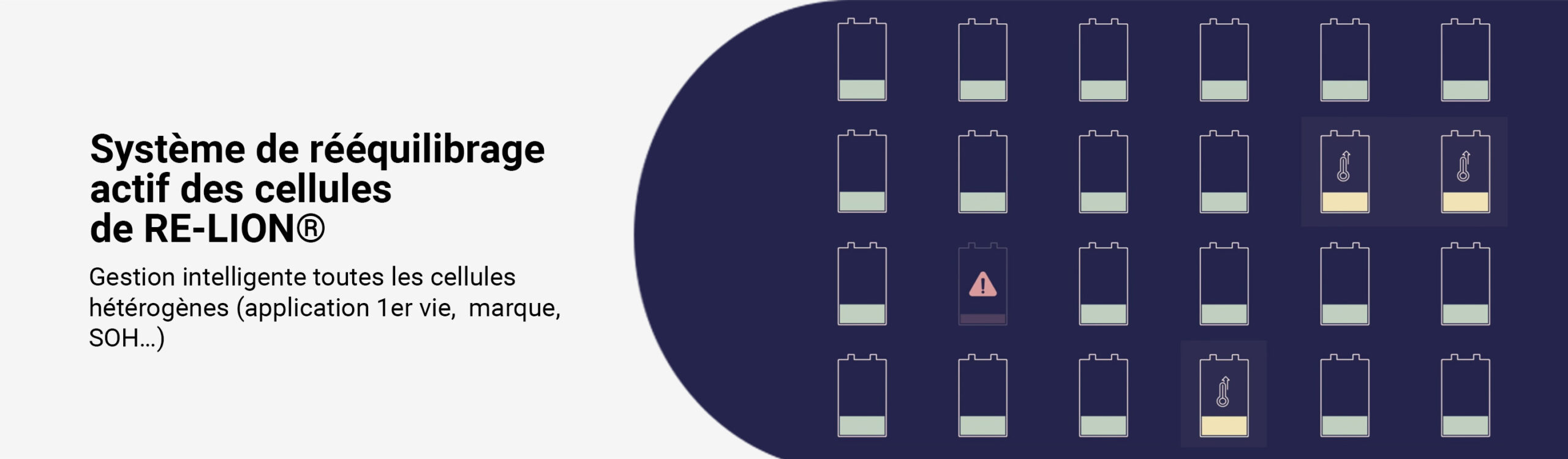 Le système de rééquilibrage actif des cellules de RE-LION est optimisé pour utiliser efficacement toutes les cellules, même si elles proviennent de différentes marques ou qu’elles ont des niveaux de performance (état de santé) variés après leur première utilisation.